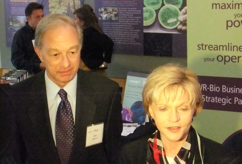 Paul Maier, Sequenom's chief financial officer, and Gov. Beverly Perdue face the TV cameras following Perdue's announcement that San Diego-based Sequenom will open a large lab in the Research Triangle.