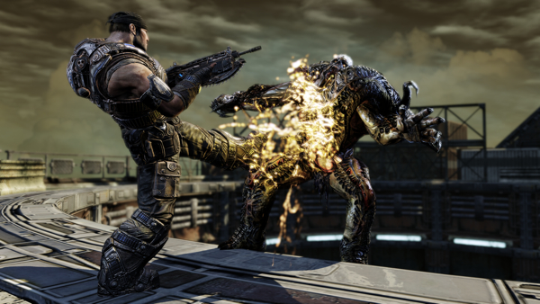 Augustus "Cole Train" Cole blasts an enemy locust soldier to save wounded teammate Anya Stroud. Gears of War 3 was available in private beta until Sunday. | Photo courtesy of Epic Games