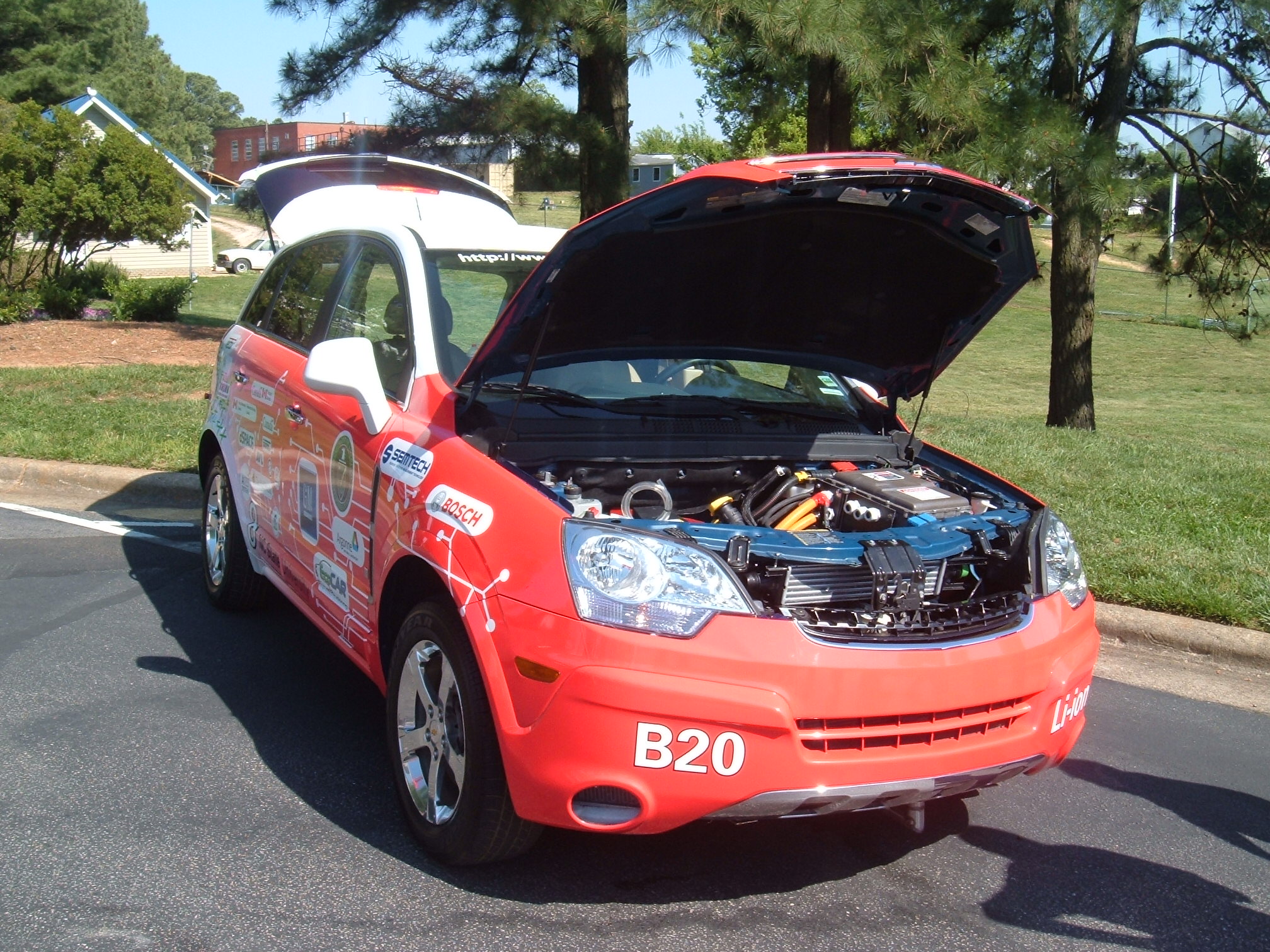 To reduce greenhouse gas emissions and fossil fuel consumption, the NCSU team installed a large lithium-ion battery pack behind the front seats of the crossover SUV. Up front is a diesel engine from an Opel Corsa, a European fuel-sipper, to power the wheels on longer-distance drives.
