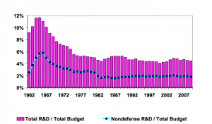 Sure, federal spending on R&D more than tripled in the past 50 years to about $147 billion in fiscal year 2009, as Lane pointed out Saturday in a talk at N.C. State University. But R&D’s share of all federal spending has been shrinking from nearly 12 percent during the height of the Apollo program in the late 1960s to about 5 percent in 2009, according to numbers from the American Association for the Advancement of Science.